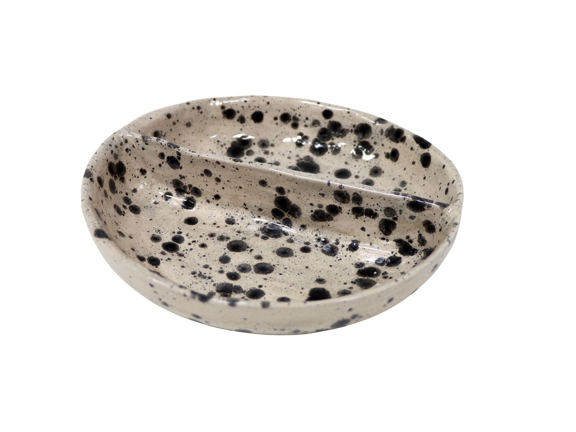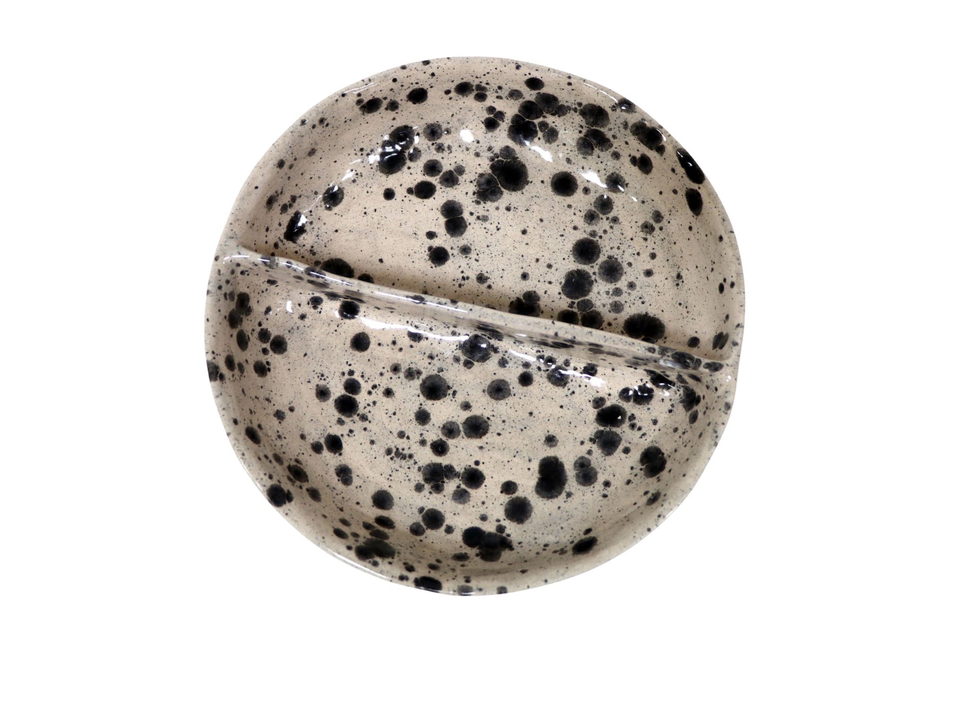 Rankų darbo keraminė užkandžių lėkštė su perskyrimu, išsiskirianti organiška forma ir išraiškingu, „kraterius“ primenančiu glazūros raštu. Šviesus fonas su tamsiais taškeliais suteikia lėkštei modernų, bet ramų charakterį ir paverčia ją išskirtiniu stalo akcentu.
