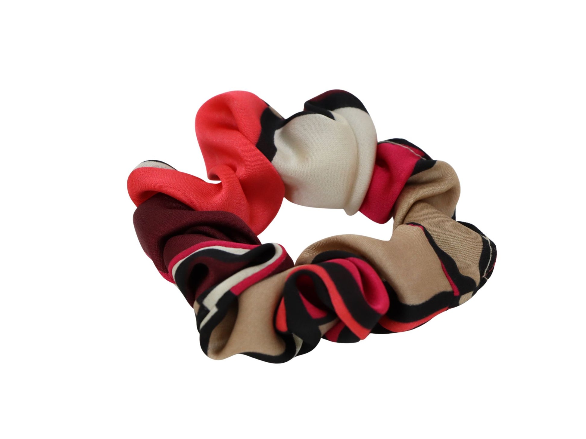 Rankų darbo plaukų gumutė su išraiškingu raštu, kuriame susilieja sodrūs raudoni, juodi ir švelnūs smėlio atspalviai. Įkvėpta kosminių motyvų, ši gumutė suteikia įvaizdžiui paslaptingumo ir išskirtinumo.