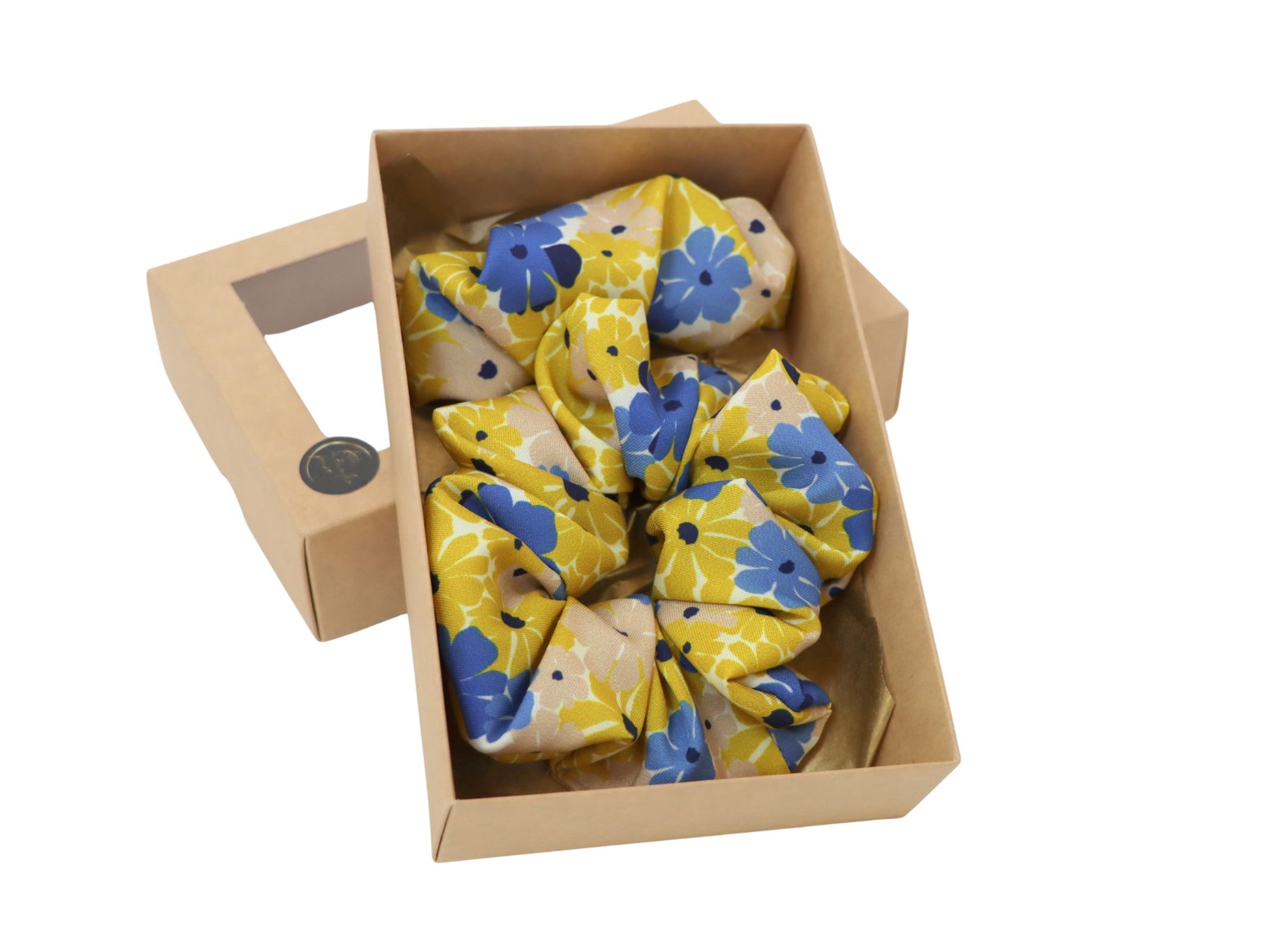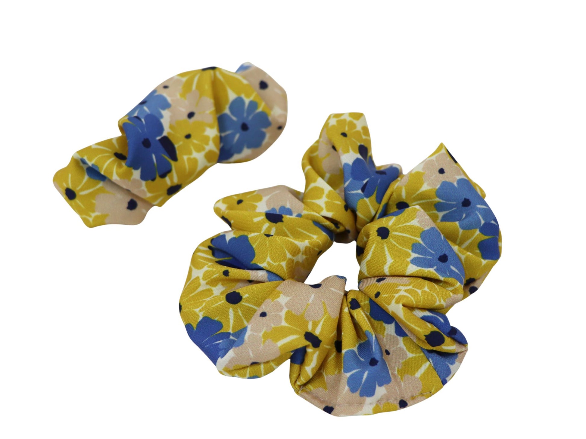 Stilingas ir žaismingas plaukų aksesuarų rinkinys, kurį sudaro gumutė ir segtukas su ryškiu geltonų ir mėlynų gėlių raštu. Šis derinys suteikia gaivumo ir spalvų akcentą kasdieniam įvaizdžiui.