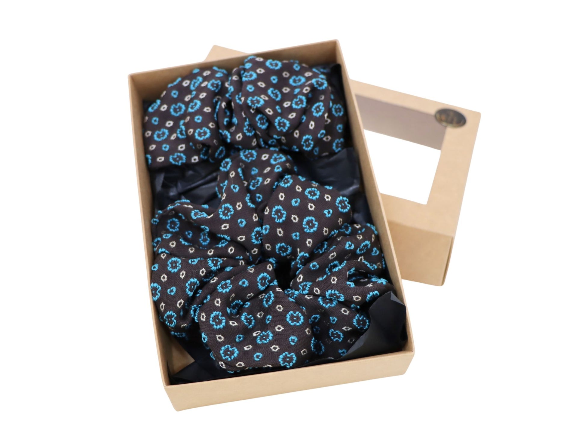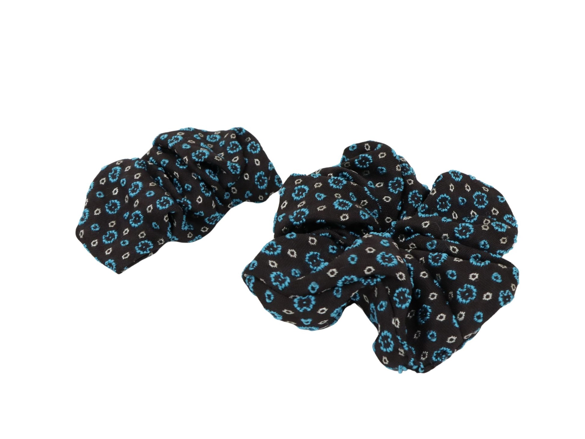 Elegantiškas plaukų aksesuarų rinkinys, kurį sudaro gumutė ir segtukas su subtiliu mėlynų raštų motyvu juodame fone. Stilingas pasirinkimas, kuris lengvai dera tiek prie kasdienio, tiek prie puošnesnio įvaizdžio.