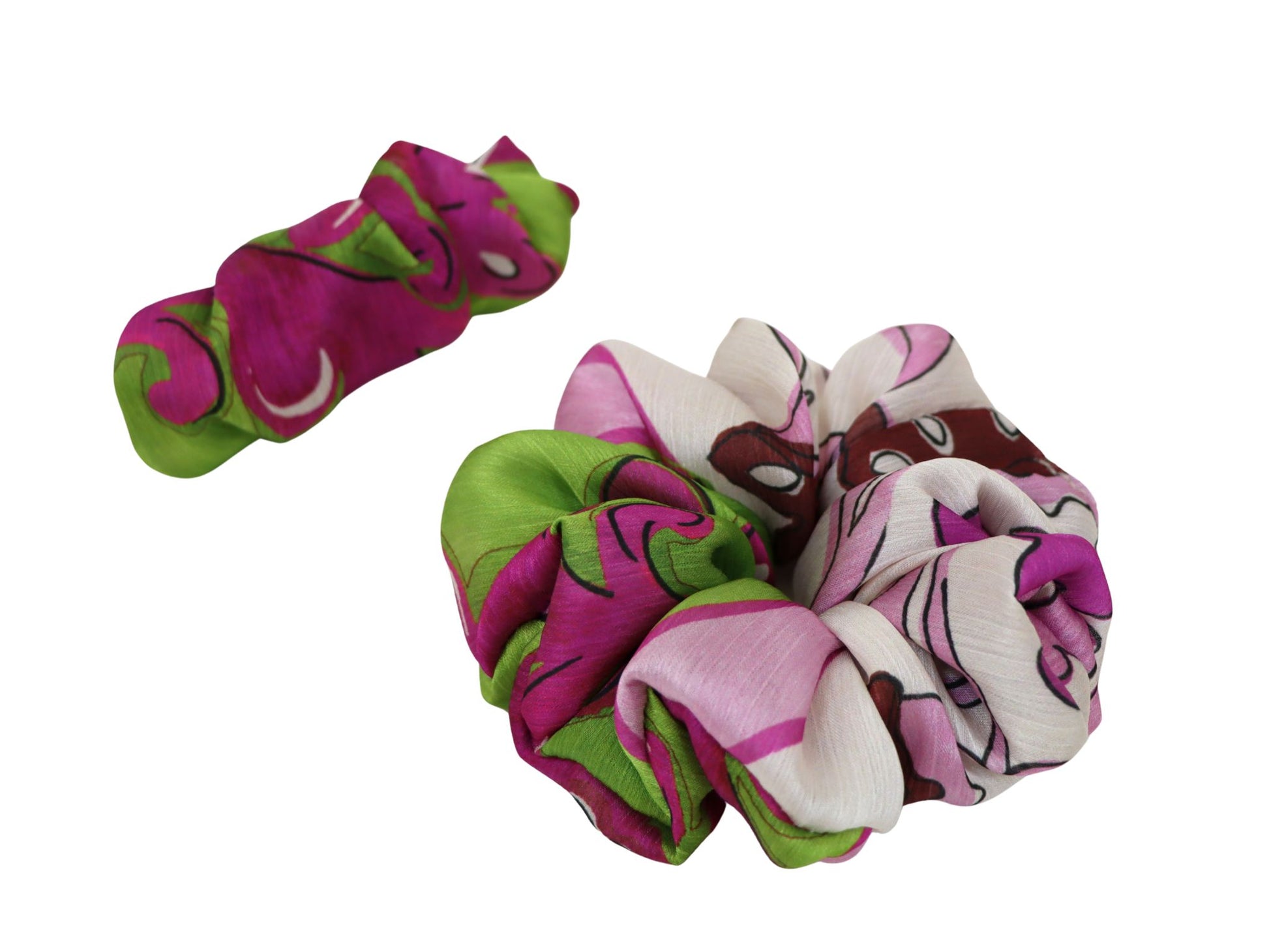 Žaismingas ir spalvingas plaukų aksesuarų rinkinys, kuriame dera rožiniai, žali ir švelnūs gėlių motyvai. Rinkinį sudaro gumutė ir segtukas – puikus pasirinkimas norint įvaizdžiui suteikti gyvumo ir išskirtinumo.
