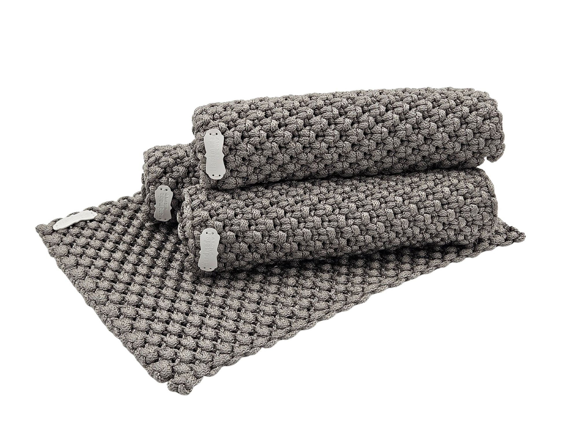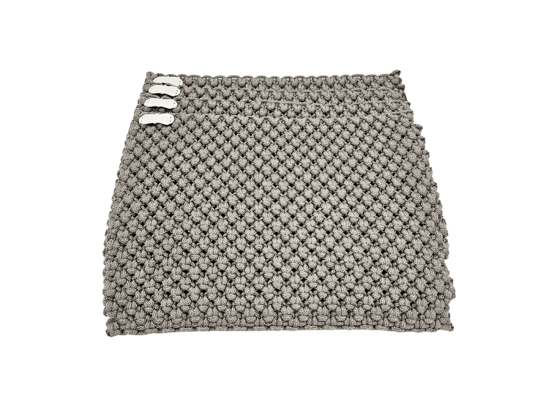 Rankų darbo nertų stalo padėkliukų komplektas, kuriame dera natūrali tekstūra, praktiškumas ir ramus, neutralus dizainas. Švelni pilka spalva lengvai įsilieja į įvairius interjerus ir suteikia stalui jaukumo bei tvarkos pojūtį.
